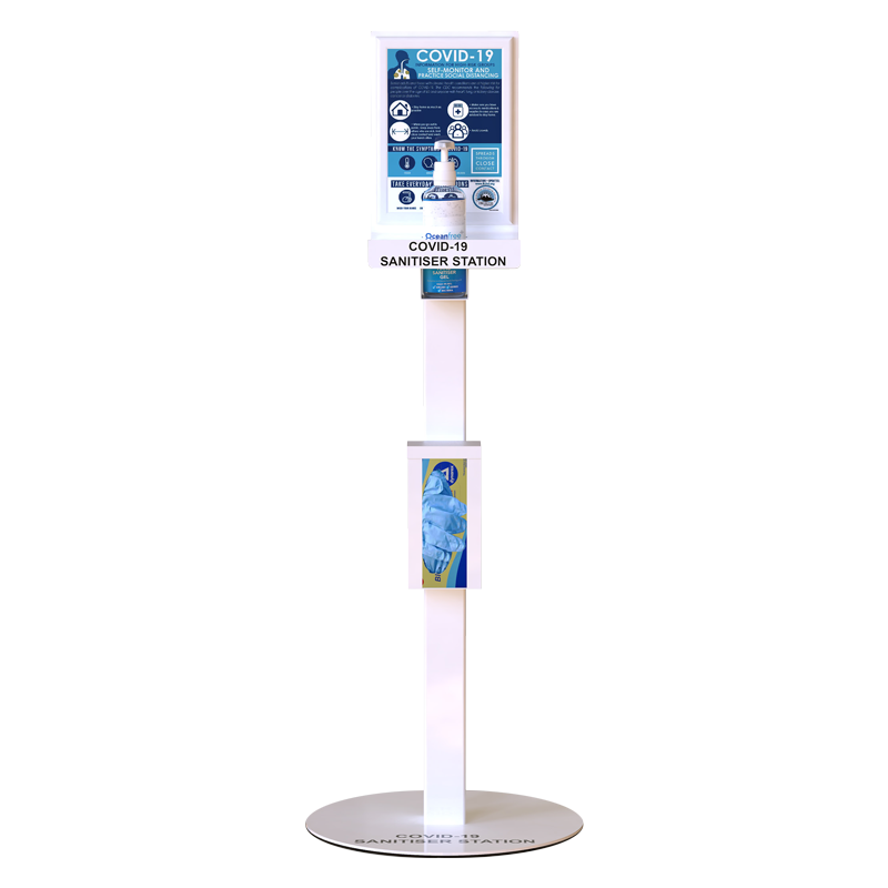 Our Standard Sanitiser Station is ideal for placement in high traffic areas, where it serves as a constant reminder to sanitise your hands. It also features a handy glove dispenser for situations where gloves are appropriate – making them readily available at recognisable stations.