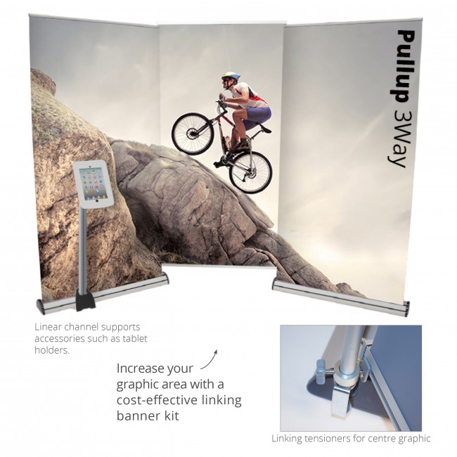 Please supply your artwork at 100% in size with 3mm Bleed to left, top and right sides while allowing 200mm bleed to the bottom of the banner as this sits within the unit. Please make sure the images are at least 150dpi at 100% in size.